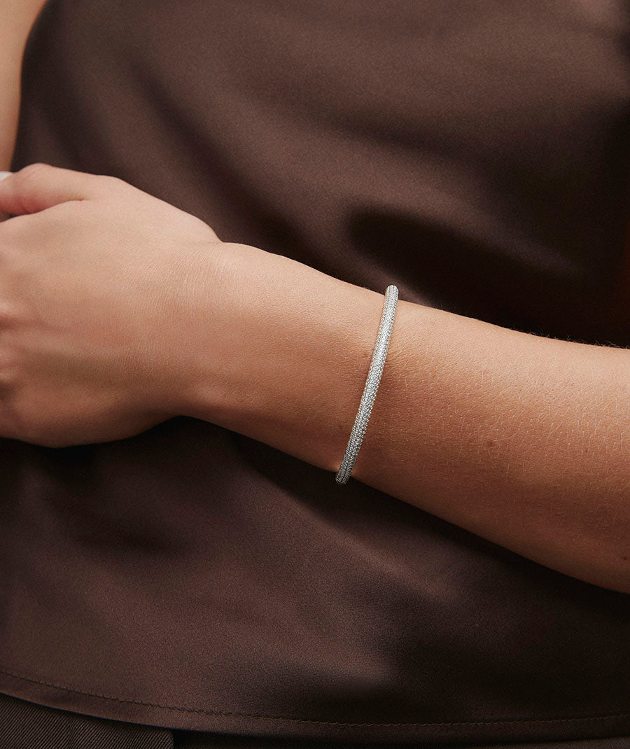 Brazalete rígido Allure bañado con una gruesa capa de Plata de ley 925, lo que garantiza una mayor durabilidad. Engastado con circonitas blancas, cuya similitud con el diamante es casi indistinguible. Tiene un diámetro de 60 x 48 mm.