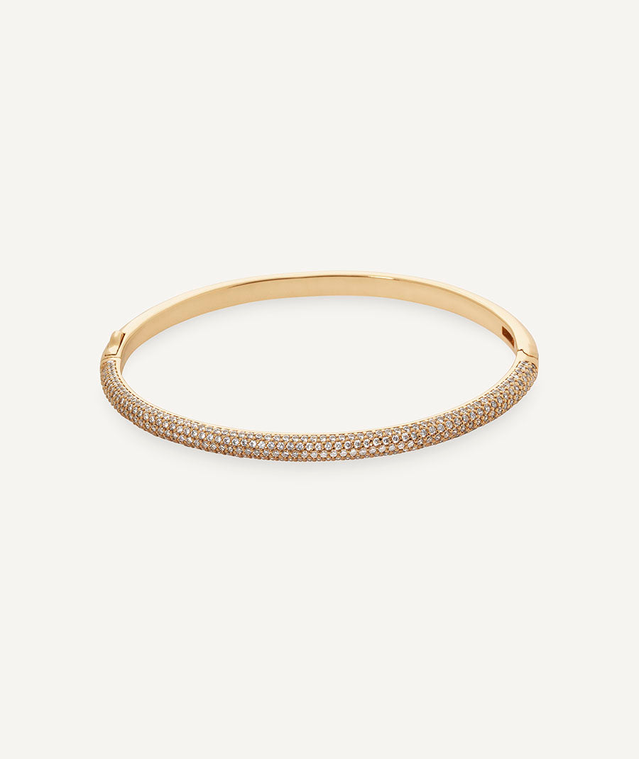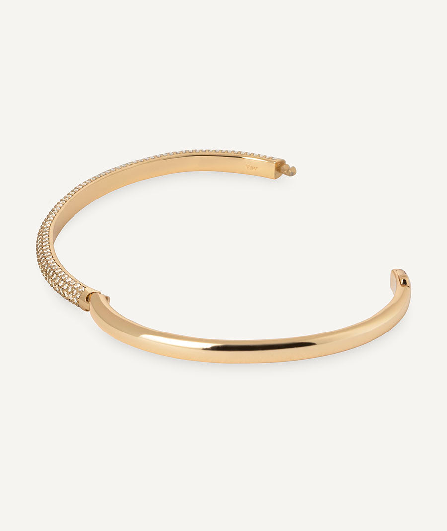 Brazalete rígido Allure bañado con una gruesa capa de oro macizo de 18 kt, lo que garantiza una mayor durabilidad. Engastado con circonitas blancas, cuya similitud con el diamante es casi indistinguible. Tiene un diámetro de 60 x 48 mm.