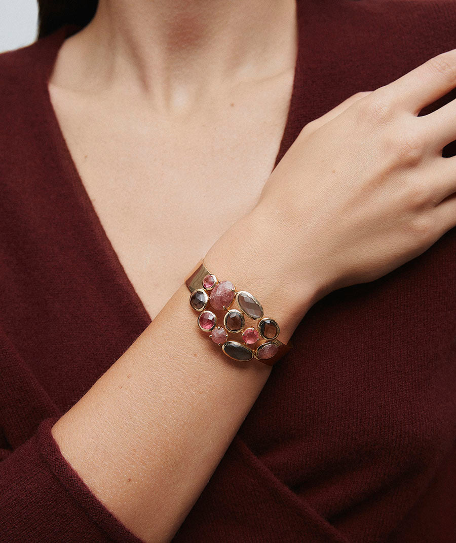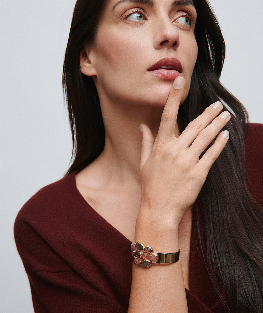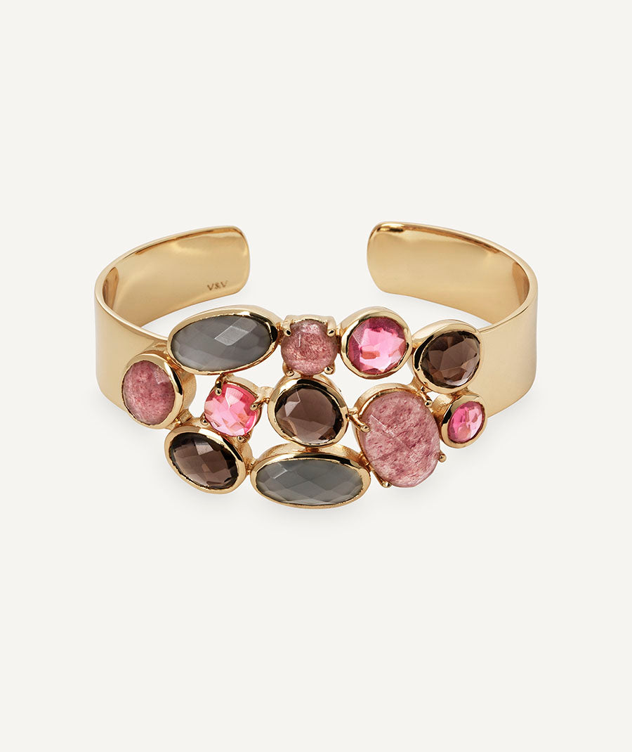 Brazalete Rosé Bruma bañado con una gruesa capa de oro macizo de 18 kt, lo que garantiza una mayor durabilidad. Destacan por sus piedras naturales engarzadas a mano de cuarzo fresa, cuarzo café, piedra luna y turmalina en tonos gris, marrón, rosa y cereza. Tiene un diámetro de 60 x 50 mm.