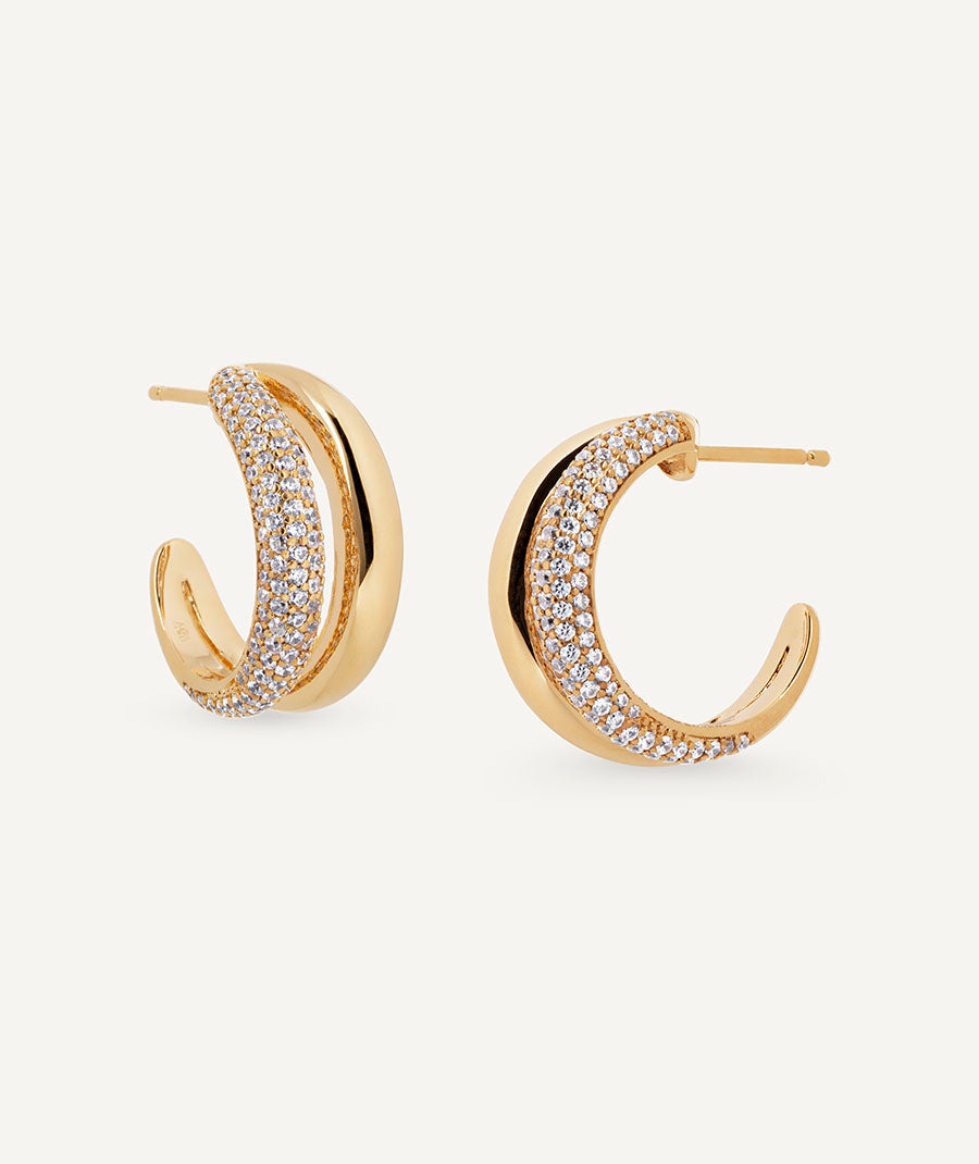 Pendientes semiluna dúo Allure bañados con una gruesa capa de oro macizo de 18 kt, lo que garantiza una mayor durabilidad. Engastados con circonitas blancas, cuya similitud con el diamante es casi indistinguible. Tienen una longitud de 21 mm y un cierre a presión.