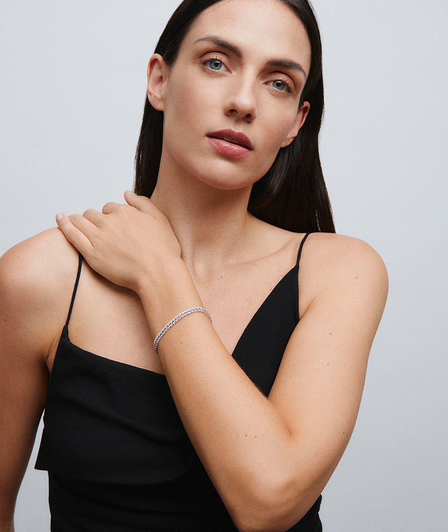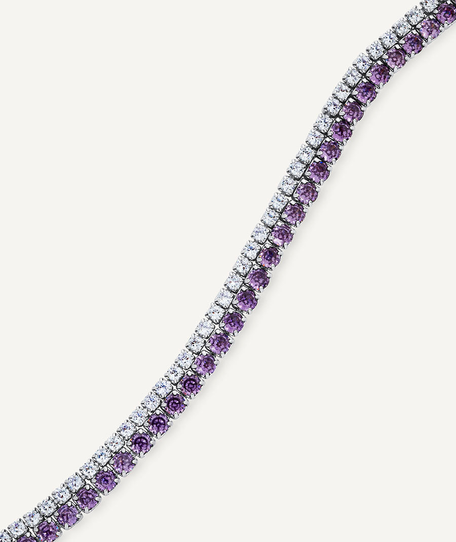 Pulsera fina Lilia bañada con una gruesa capa de Plata de ley 925, lo que garantiza una mayor durabilidad. Engastada con circonitas color lavanda y amatista, cuya similitud con el diamante es casi indistinguible. Tiene un diámetro de 17 cm + 5 cm cadena ajustable.