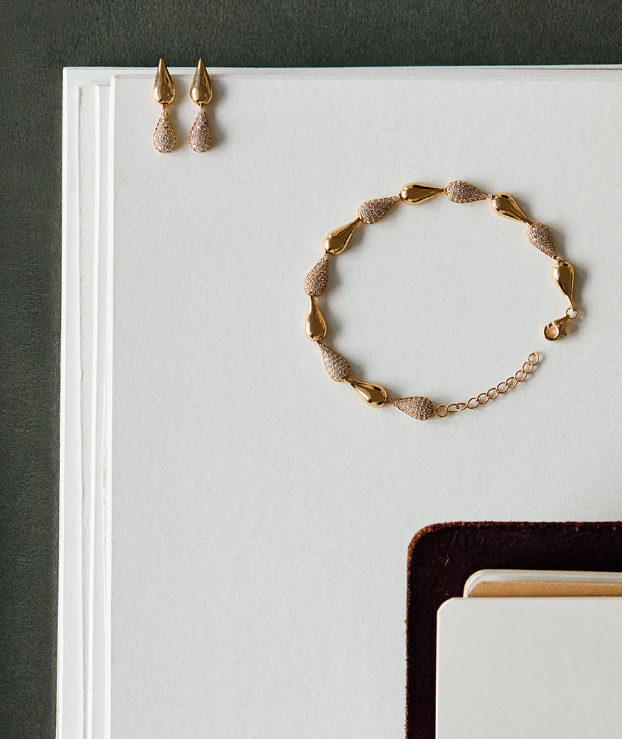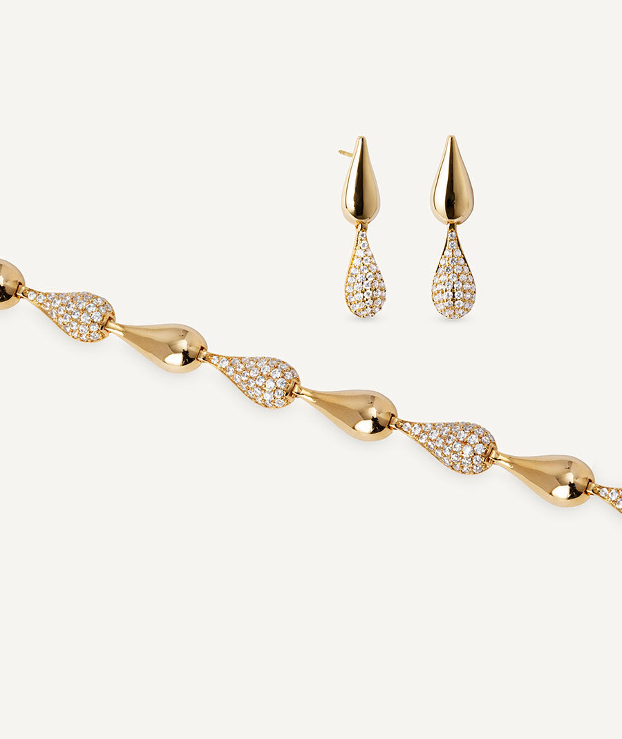 El set Drops está formado por pendientes y pulsera con forma de gotas engastadas con circonitas blancas, cuya similitud con el diamante es casi indistinguible. Las joyas están bañadas con una gruesa capa de oro macizo de 18 kt, lo que garantiza una mayor durabilidad. La pulsera tiene un diámetro de 17 cm + 3 cm de cadena ajustable y los pendientes cuentan con un cierre a presión.